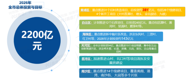 作为广州城市更新的 “主力军”,黄埔区在广州城市更新计划中占据核心地位,根据《广州市 2026 年重点建设项目计划》,黄埔区全年将重点推进 31个旧村改造项目,总投资381亿元,这一投资规模在广州各区中遥遥领先。