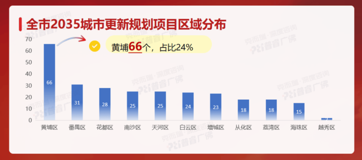 黄埔区的旧改实力不仅体现在投资规模上,更在规划布局上形成断层优势。据普睿数智监测,在广州2035年城市更新规划的275个项目中,黄埔区占据66个,占全市总量的24%,是第二名番禺区(31个)的两倍多,规划项目数量断层领先。