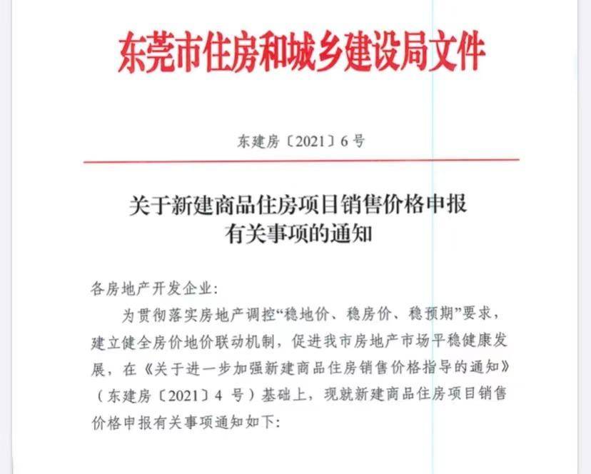 据悉,为贯彻落实房地产调控“稳地价、稳房价、稳预期”要求,建立健全房价地价联动机制,促进东莞房地产市场平稳健康发展,在《关于进一步加强新建商品住房销售价格指导的通知》(东建房〔2021〕4号)基础上,现就新建商品住房项目销售价格申报有关事项发布通知。