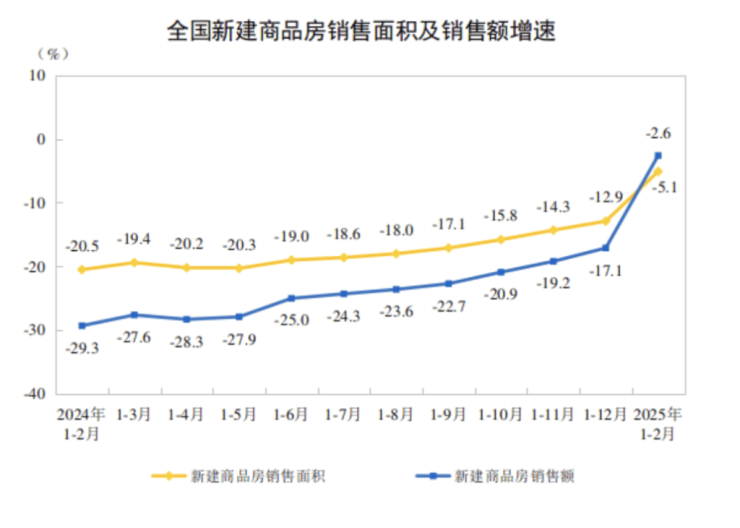 国家统计局发布2025年1-2月份全国房地产市场基本情况。国家统计局数据显示,今年前两个月,房地产开发投资同比降幅比2024年全年收窄0.8个百分点,其中住宅投资降幅收窄了1.3个百分点;从销售端数据看,今年1-2月份,房地产市场交易总体平稳,全国新建商品房销售面积和销售金额同比降幅分别比上年全年收窄了7.8个和14.5个百分点。从监测的40个重点城市来看,前两个月新建商品房销售面积和销售金额同比分别增长了1.3%和7.1%。