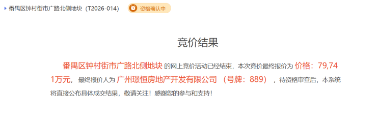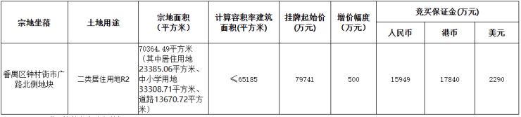 2月13日,番禺区钟村街市广路北侧地块成功出让,由广州璟恒房地产开发有限公司(敏捷)以总价79741万元夺得,折合楼面价12233元/平方米。