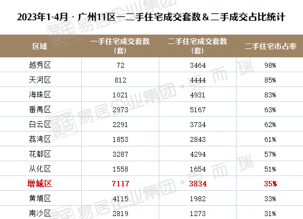 数据显示,今年1-4月,增城区的二手住宅市占率是35%,仅高于黄埔和南沙。
