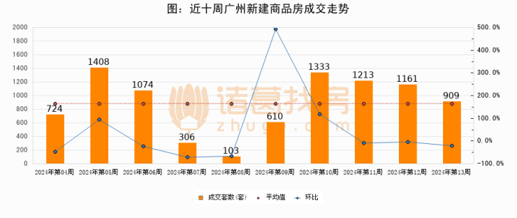 进入2024年第12周(03月18日-03月24日),广州新建商品房成交909套,较上周减少252套,环比下降21.7%