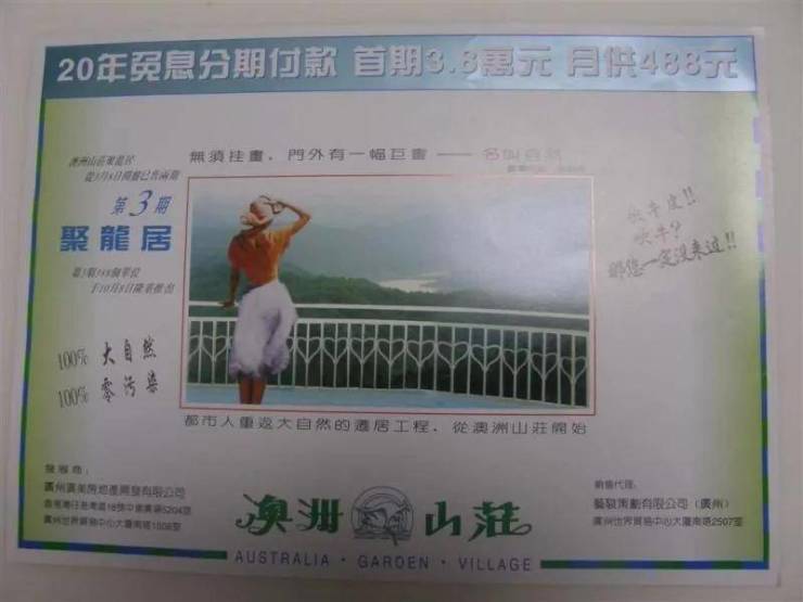 1996年,澳洲山庄入市,以“20年免息分期付款,首付3.8万,月供只需488元”的广告口号,加之依山傍水的居住环境,吸引了广州近2000户买家入手。