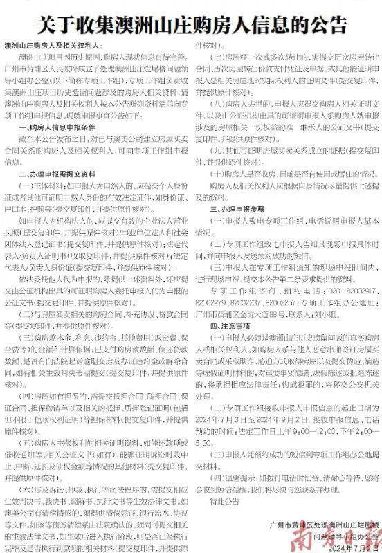 2024年7月初,黄埔区人民政府成立了处理澳洲山庄烂尾楼问题领导小组办公室,收集澳洲山庄购房人信息。