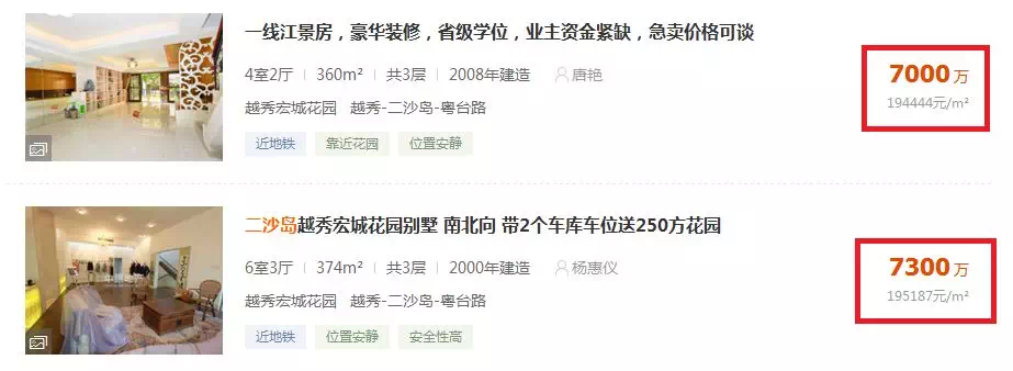 由于二沙岛已不再推出住宅用地,所以岛上所有别墅都是二手楼或者只租不卖。再参考一下二手楼的价格,均价在20万/平左右。