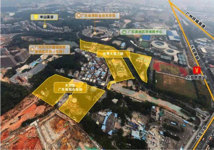 地块与世界大观三期地块相邻,驾车30分钟内可快速到达珠江新城、琶洲商务区、广州国际生物岛、广州大学城等重要功能片区。周边有广东体育职业技术学院、广东奥林匹克体育中心、中海康城花园等。