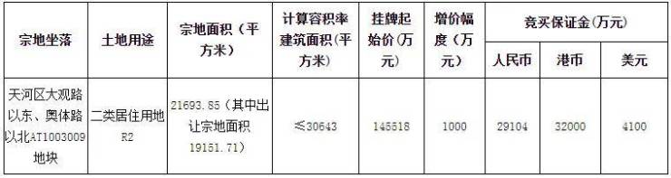 天河区大观路以东、奥体路以北AT1003009地块成功出让,竞得人为越秀地产,地块成交总价145518亿元,成交楼面价约4.75万/㎡。