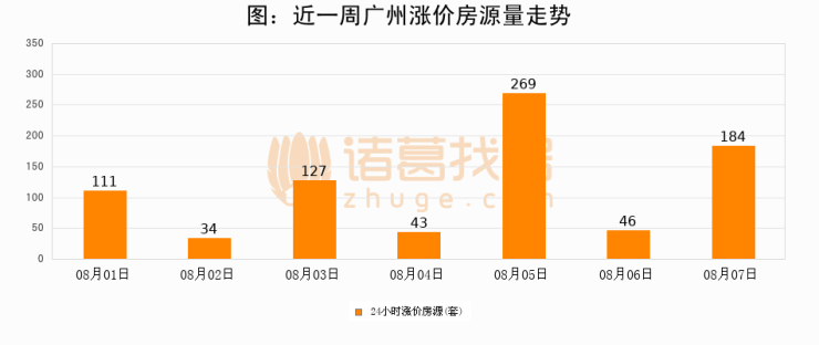 根据诸葛找房数据显示,广州24小时涨价房源量为184套,较08月06日增加138套,环比上涨300%。与此同时,涨价房源占比小幅扩大,业主信心有所提升。