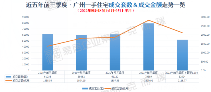 克而瑞数据显示,2022年1月-9月上半月,广州一手住宅总计网签成交5.2万套,合计共2118.77亿元。