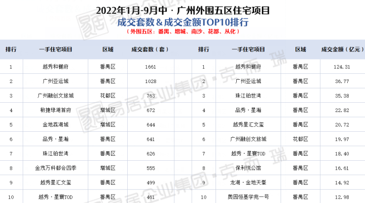 据克而瑞监测,2022年1月-9月上半月,广州合计有4个板块一手住宅成交金额突破100亿,TOP3板块合计揽金超过440亿!