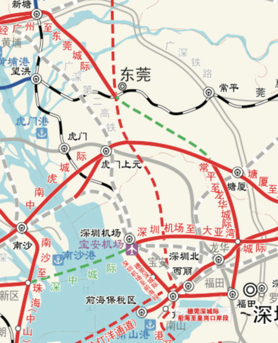 广深中轴城际线路起点由常平调整至东莞中心,且经过皇岗口岸,与香港仅一步之遥。