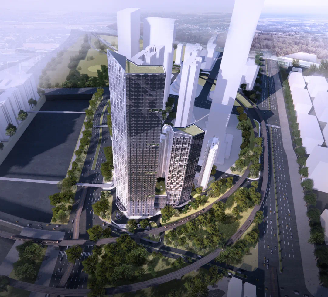 其中住宅较高为96.7米31层,较低为87.7米28层的超高层住房,办公由两栋双子大厦组成,一栋高140.7米28层,一栋为235.2米49层。