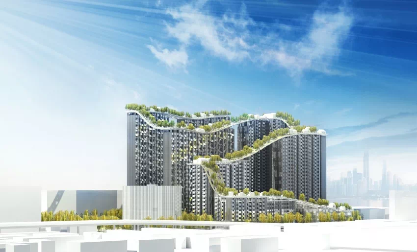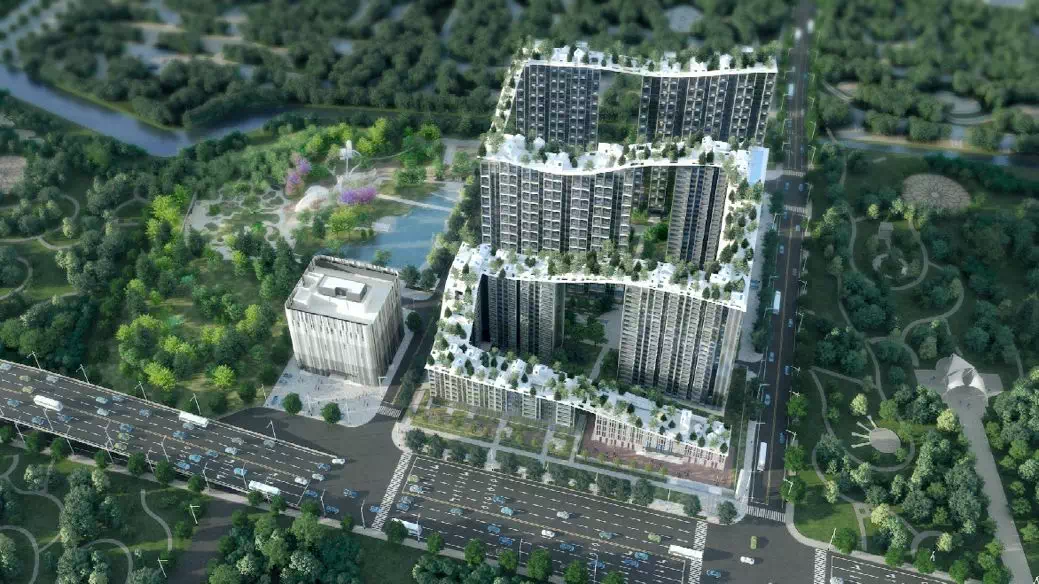 森林从屋顶延展下来,连接起8栋建筑,看起来就像是浮在大型的住宅群落上。