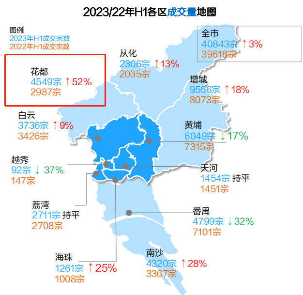 2023年上半年,花都区新房成交4549宗,同比上涨52%,增幅位居广州第一;二手住宅成交上涨 35.4%,增幅位列全市第四;一手商铺同比增长168%,增幅位列广州第三;全区商住用地成交面积同比增长119%。