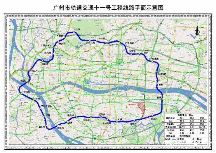 广州地铁首条“环线”11号线,线路全长约43.2公里,设32座车站,全部走地下。其中19座换乘站。线路起于新滘东路,经琶洲会展中心、员村、天河公园、华师、广州东站、云台花园、广州火车站、流花湖公园、荔湾湖公园、芳村、广州造船厂、逸景路,之后沿新滘路闭合形成环线。线路穿越广州市主城区,串联广州市天河区、白云区、越秀区、荔湾区和海珠区,连接广州火车站、广州东站等大型交通枢纽。