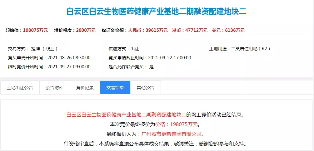 该项目地块于今年10月成功出让,由广州城市更新集团有限公司以198075万元竞得。