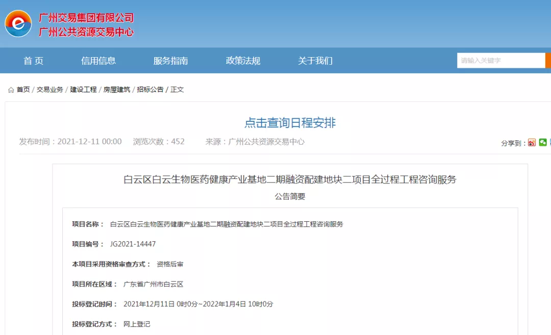 近日,广州公共资源交易中心发布了白云生物医药健康产业基地二期融资配建地块二项目全过程工程咨询服务招标公告。