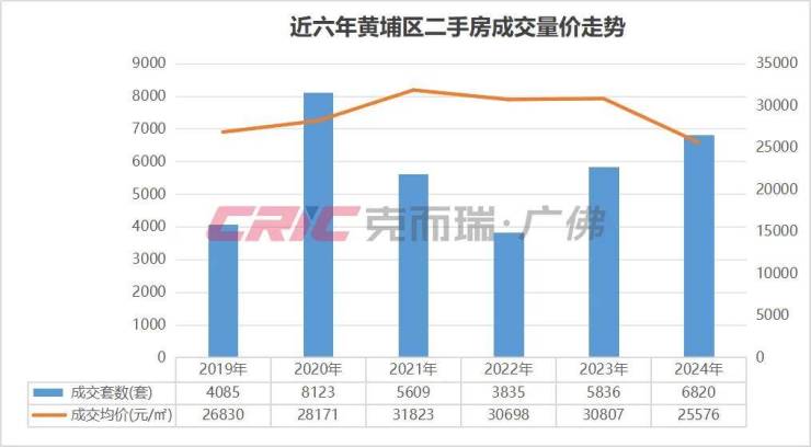 克而瑞数据监测显示,2024年黄埔区二手房成交6820套,同比去年增长14%,位列近六年来次新高,仅次于2020年。