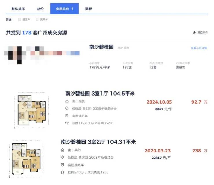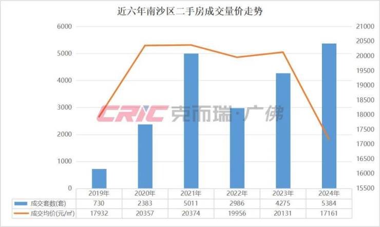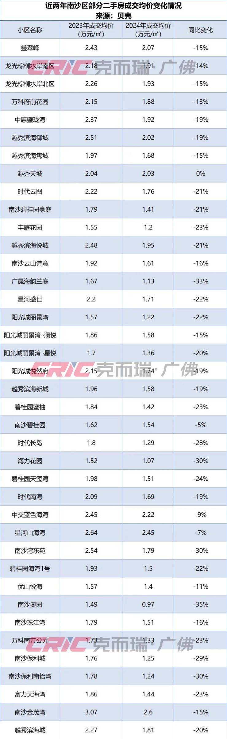 南沙方面,克而瑞数据监测显示,2024年南沙区二手房成交5384套,位列近六年最高,成交均价17161元/㎡,同比下跌15%,为全市第三高,同样“以价换量“明显。