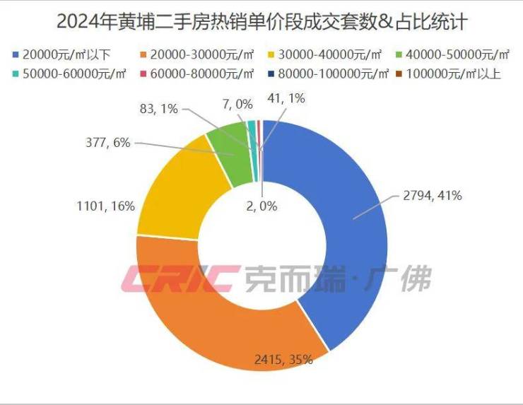 在热销单价段上,克而瑞数据监测显示,近两年黄埔二手房热销单价段均为2万/㎡以下,成交占比由2023年的35%增长至41%,占比达到了近六年来的最高。