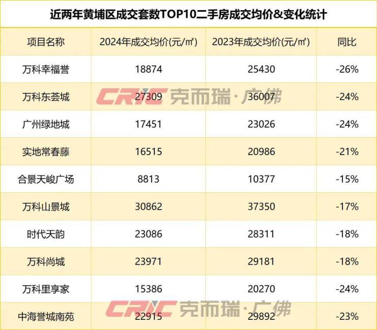 可以看到,2024年黄埔区热销套数TOP10小区中,成交均价同比跌幅大于20%的小区占据了六个。