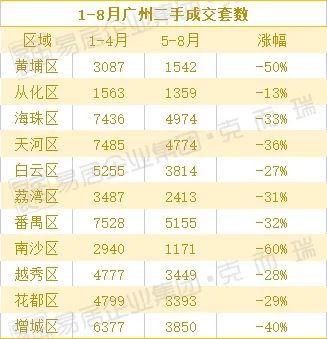 重锤之下,无一幸免,广州11个区的二手房成交均受到不同程度的打击。把今年1-4月和5-8月的二手房成交量分开来看,南沙无疑跌得最猛,足足跌了六成!
