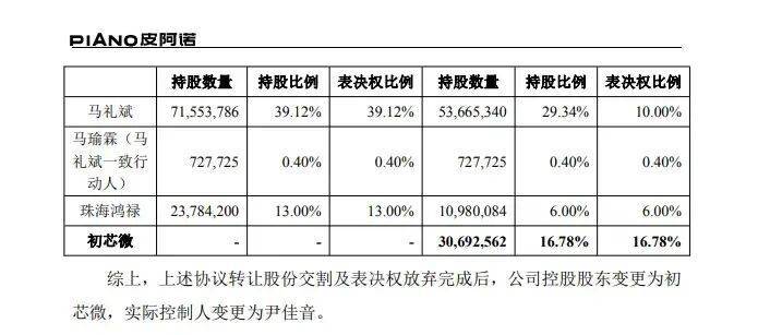 根据皮阿诺2025年12月的系列公告,马礼斌与初芯微、初芯微与珠海鸿禄分别签署了股份转让协议,并涉及复杂的表决权放弃安排。若交易最终完成,公司控股股东将变更为初芯微,实际控制人变更为尹佳音。