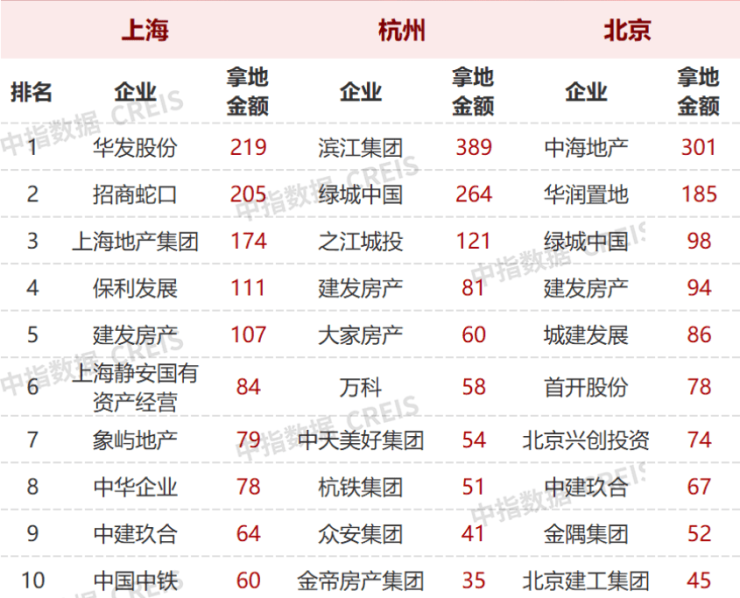 “从重点城市拿地金额TOP10房企来看,央企国企仍是拿地主力。华润置地、中海地产、保利发展等全国性龙头企业仍在多个重点城市广泛布局,重点城市拿地金额TOP10房企中有半数以上为央企国企,这与稳健型央国企的资金状况相对较好有直接关系。民营企业中,滨江集团保持杭州区域龙头地位,牢牢占据杭州市拿地金额榜首。”刘水表示。