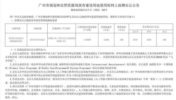 该项目地块于2024年12月由广州奥港置业有限公司通过挂牌出让形式竞得。土地出让文件显示,项目需参照《广州市普通中小学校建设标准指引》,建设约1500人规模的教学楼及相关配套,主要包括普通教室、国家级标准游泳场、室内多功能体育馆、室外田径场、STEM教室、艺术教室(包括美术、音乐、舞蹈及琴房)、人工智能大模型实验室、物理、化学、生物实验室、科学教室、图书馆、报告厅、教学办公区等教育教学空间。