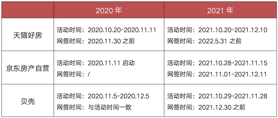 天猫好房和京东房产自营均是首先报名填写信息,之后完成看房、认购签约流程、然后平台审核,最终发放礼包的方式,天猫好房报名截止至12月10日,但认购签约周期长达半年,相较去年的11月30日有明显延长。贝壳活动10月29日开启活动要求购房者1个月内完成认购,12月30日之前完成网签即可,相比去年的12月5日也有明显延长。京东X我爱我家联合活动11月11日开启,仅针对二手房,活动时间截止至12月10日,但要求购房者在2022年2月11日之前完成过户并缴纳佣金即可。