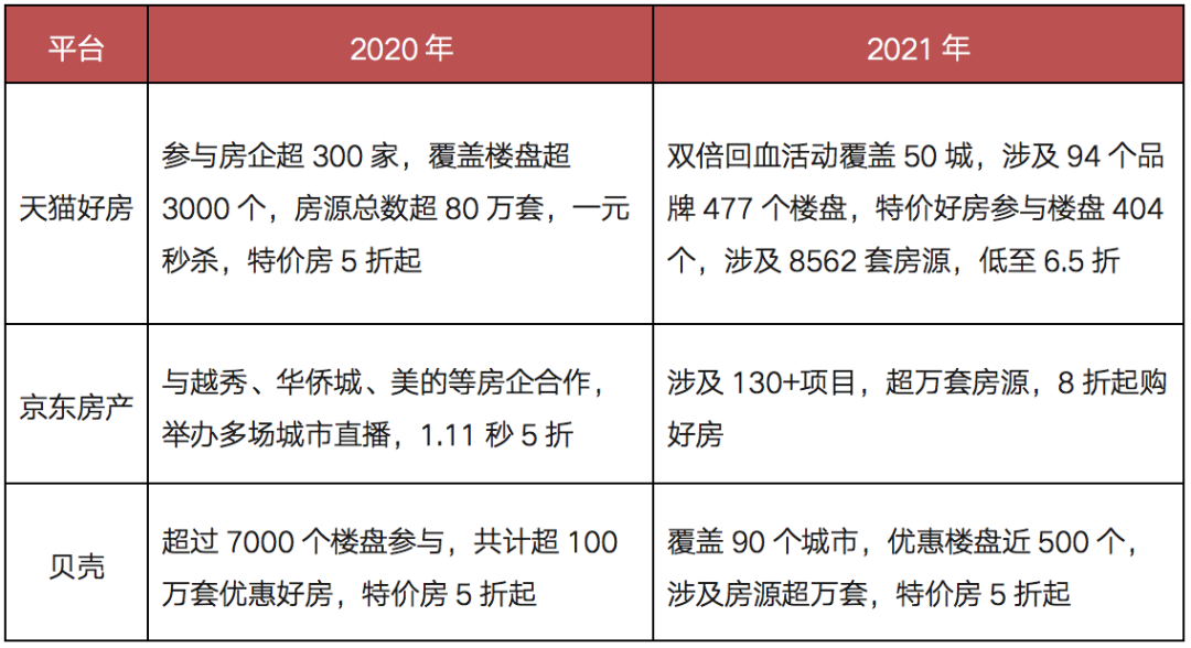 从今年刚刚过去的“双十一”活动情况来看,天猫好房2020年首推“好房双十一”引发行业内外共同关注,参与房企超300家,覆盖楼盘超3000个,房源总数超80万套,一元秒杀,特价房5折起。到了2021年“双11” 双倍回血活动覆盖50城,涉及94个品牌477个楼盘,特价好房参与楼盘404个,涉及8562套房源,低至6.5折。
