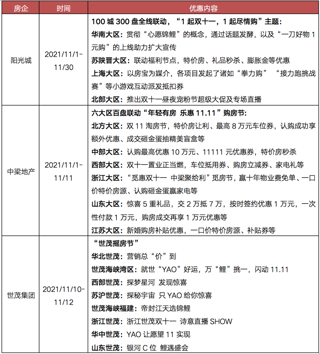 今年刚刚过去的“双十一”多数房企在自有平台上仍延续年初以来的一贯策略,采用“集团造节+精准让利”的策略。即集团层面统一主题,各大区域及项目再根据自身情况制定优惠举措。