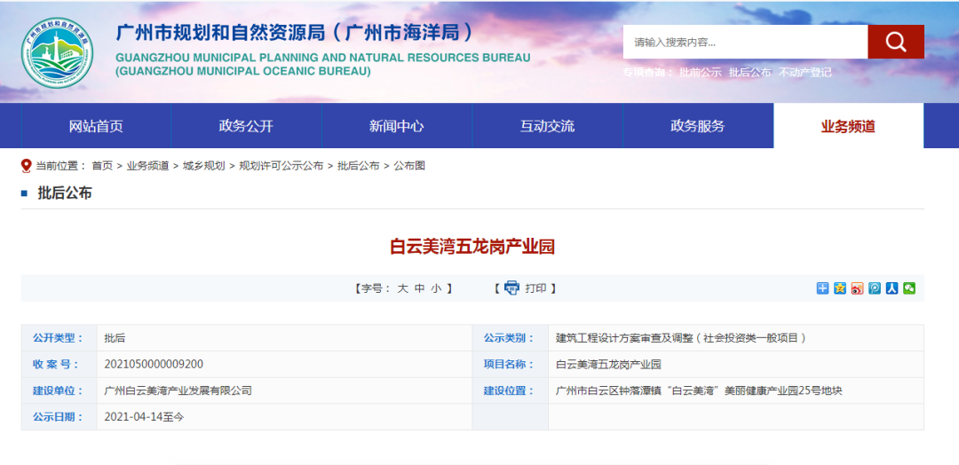 近日,广州市规划和自然资源局发布了《白云美湾五龙岗产业园设计方案批后公布图》。