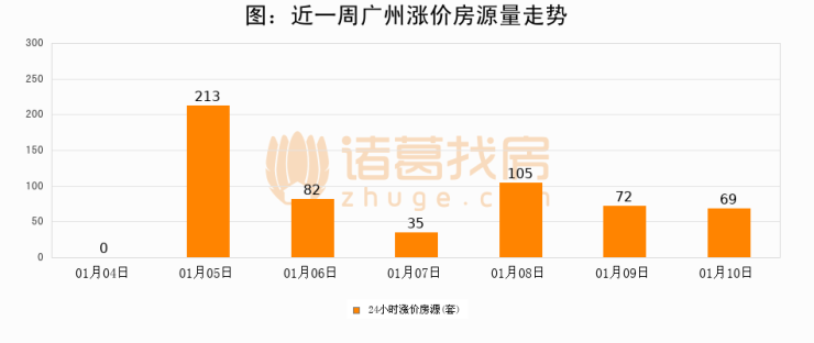 根据诸葛找房数据显示,广州24小时涨价房源量为69套,较01月09日减少3套,环比下降4.2%。与此同时,涨价房源占比小幅回落,对于购房者来说是一个入市窗口期,购房者可抓住时机入市。