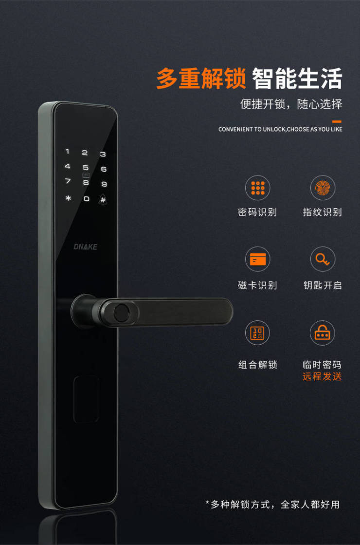 作为中国安防十大影响力品牌,“安全”二字深深烙印在狄耐克每一个产品中。狄耐克智能门锁采用304不锈钢锁体,内置C级锁芯,耐用更安全。高灵敏的感应速度,可在3秒内完成开锁。除此之外,它具有试开预警功能,在密码三次连输错误后,系统将自动锁定并上传预警。它还可以通过临时密码设置,实现访客在局域网内的安全入户。