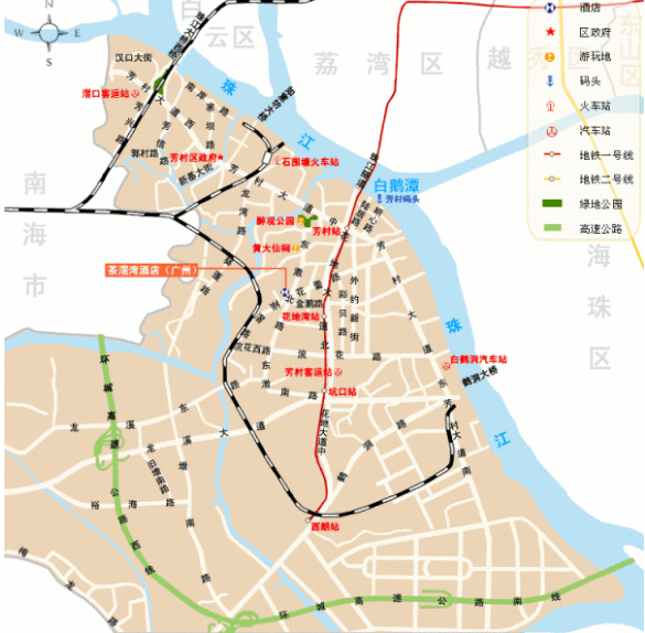 芳村地处珠江西岸,北部由珠江大桥、珠江隧道与荔湾区的西关地区相连,东部由鹤洞大桥与海珠区相连,南部由东沙大桥与番禺区相接。