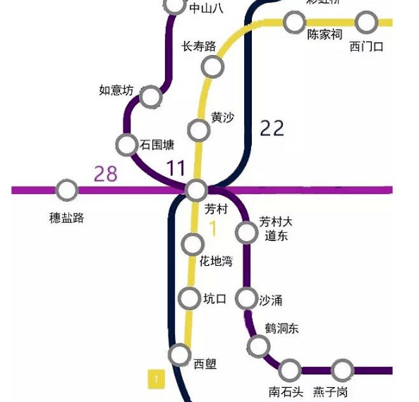 已经建成的1号线(西朗-广州东)、正在动工的11号线(广州中心区环线)/22号线(白云机场-广州南站快线)、规划中的28号线(广佛东西向快线)。