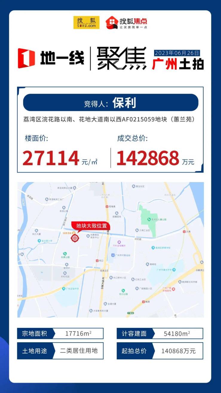 6月16日,中海以19.9亿拿下花地湾的紫兰苑地块,楼面价25089元/平;10天之后,保利以14.28亿拿下惠兰苑地块,扣除配建后楼面价27113元/平。