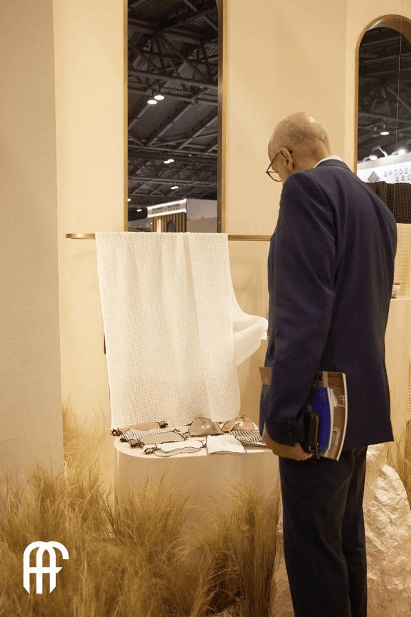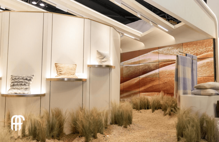 AMAZE FIBER美络工坊“柔织沙影”设计空间,抽象化的流沙影像,多重感官的沉浸体验,以沙漠、白石、柔性织物、随性飞草诠释自然与极简概念。灵动视觉元素与静态交错,折射出品牌关注可持续面料材质与设计创新理念。