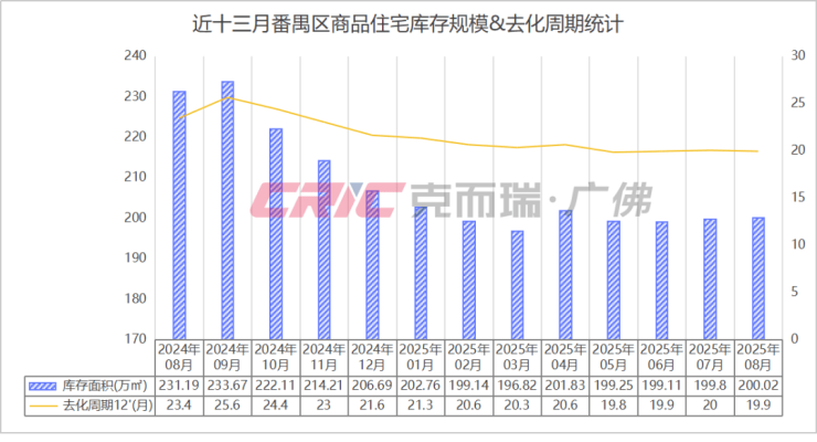 随着流速的加快,克而瑞数据监测显示,截至2025年8月末番禺区商品住宅库存200.02万㎡,去化周期19.9个月,低于全市平均水平。