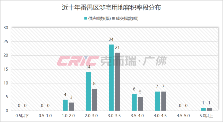 在土地市场表现上,克而瑞数据监测显示,2015-2024年番禺区累计供应56宗涉宅用地,成交45宗,容积率在1.0-2.0的土地宗数仅有3宗,因此该地块1.1的容积率具备一定的稀缺属性。