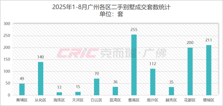 今年1-8月番禺区二手别墅成交225套,位列十一区第一,购买力旺盛。