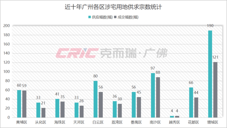 番禺土市的近十年供求规模位列十一区中上游水平,也在一定程度上反映出了番禺成为房企进驻的热门选择。