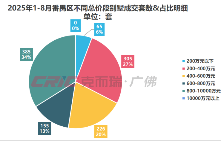 按照总价段划分,克而瑞数据监测显示,今年1-8月番禺区别墅热销总价段集中在800-1000万元,共成交385套,占比34%。