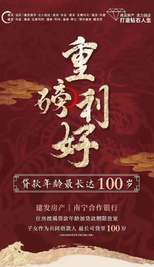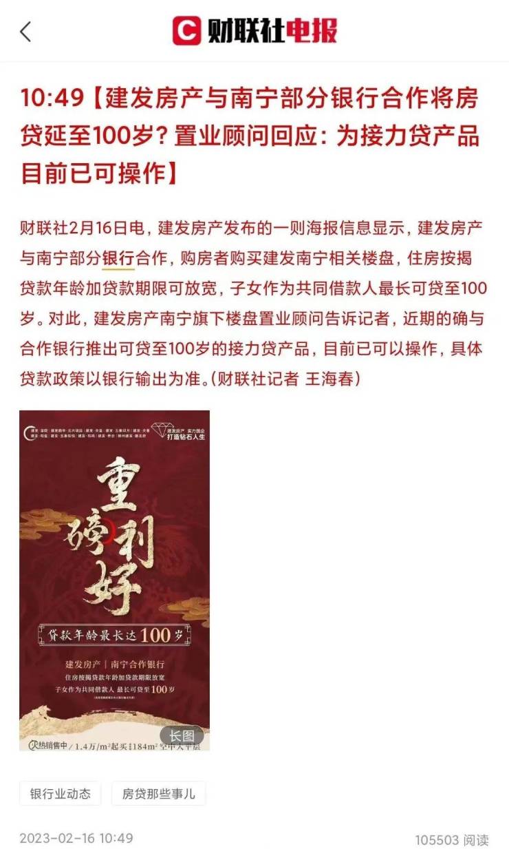 据悉,近日,有消息称广西南宁某开发商发出楼盘销售广告,其与部分合作银行可以做到“子女作为共同借款人,最长可贷至100岁”。