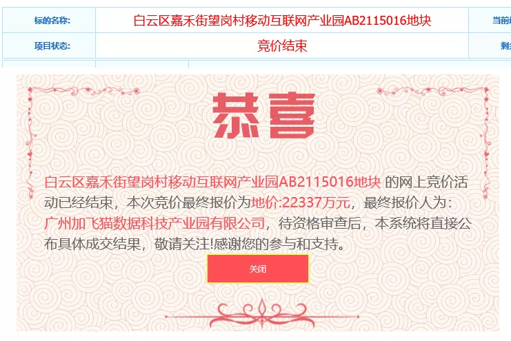 4月16日,广州加飞猫数据科技产业园有限公司以22337万元拿下白云区嘉禾街望岗村移动互联网产业园AB2115016地块。这是该产业园今年出让的第三宗商业兼容商务用地。