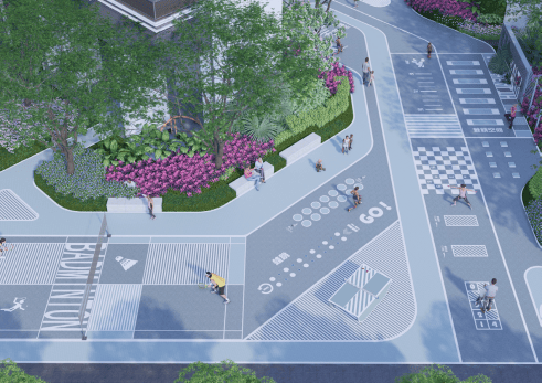 舒心化颐养体系(长辈):为贴心满足长辈的日常生活所需,社区配置了健康步道、林荫空间、空中疗愈花园等,丰富多样化的植物组团和沙发、下棋室,为老人提供极佳的日常聚会场地,并配有扶手安全设计、园林步道、防滑设计等。