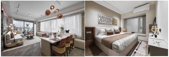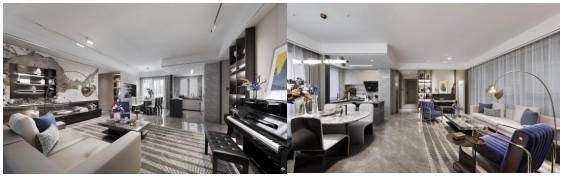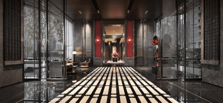 在材料搭配选取上,运用黑色镜面石材,搭配香槟金装饰条、木棉花酒红色,并通过多层质感材料的碰撞表达,营造精奢雅致的酒店式归家氛围。