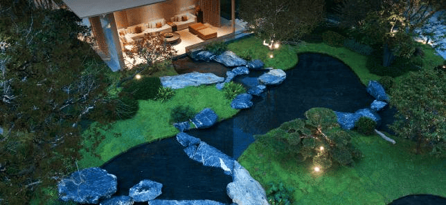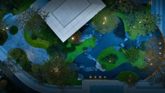 进入园林后,郁郁葱葱的森林之中清泉涌动,弯弯绕绕着汇聚到远处,正立着座漂浮的「江浪会客厅」——邀上三五好友曲江对饮,岛屿之上江浪宴客